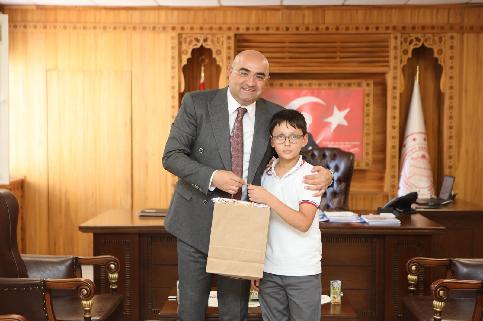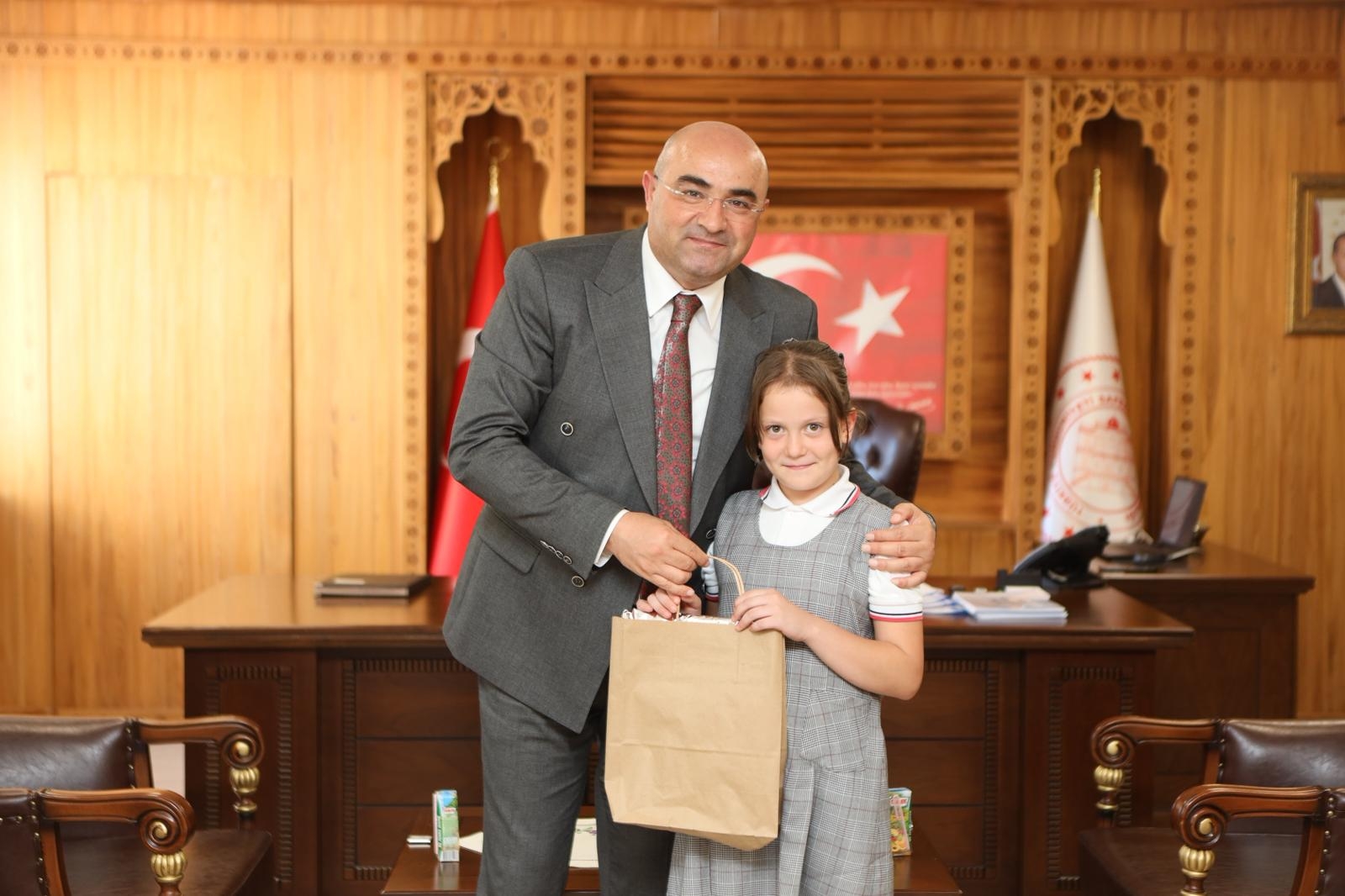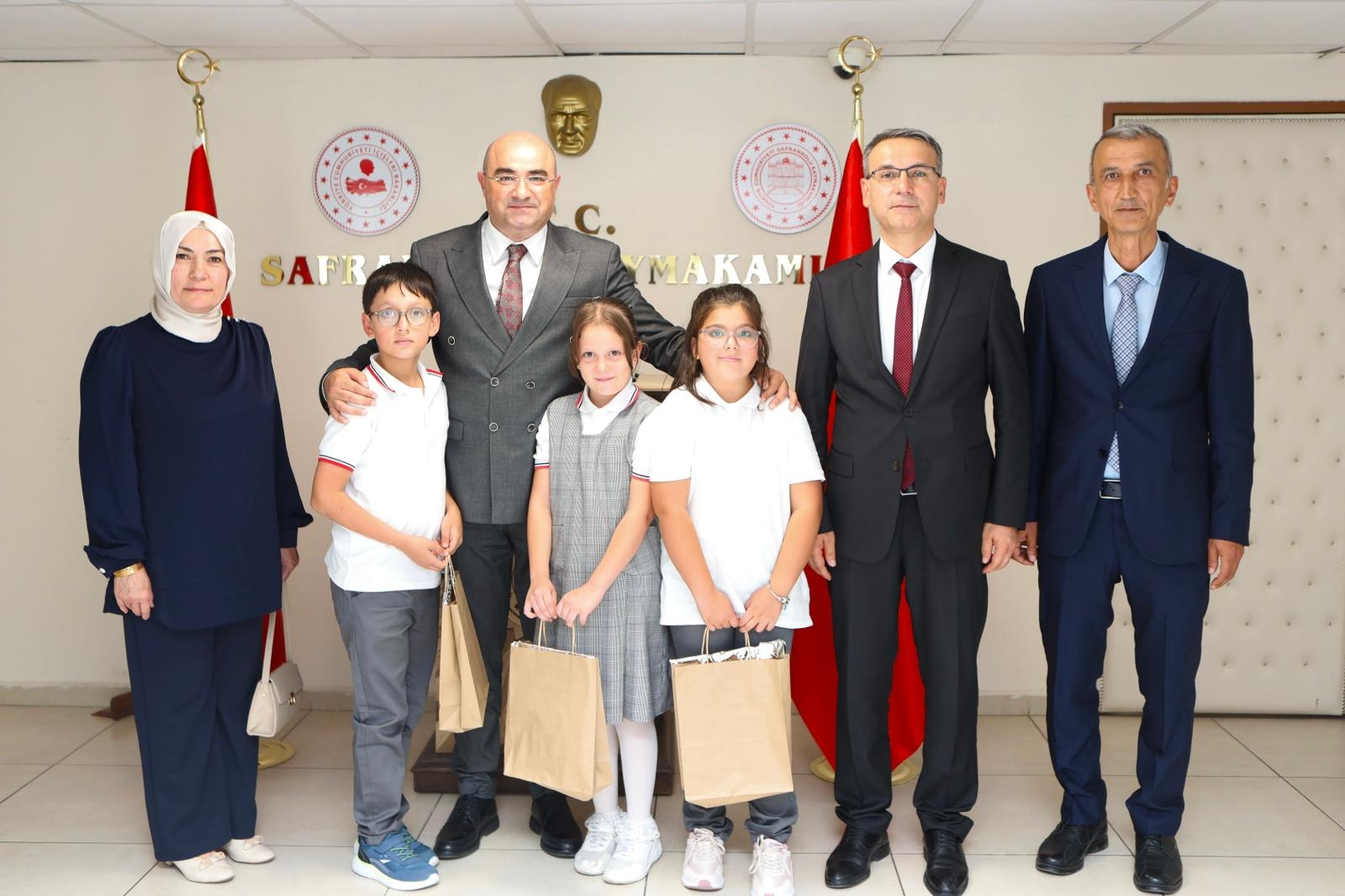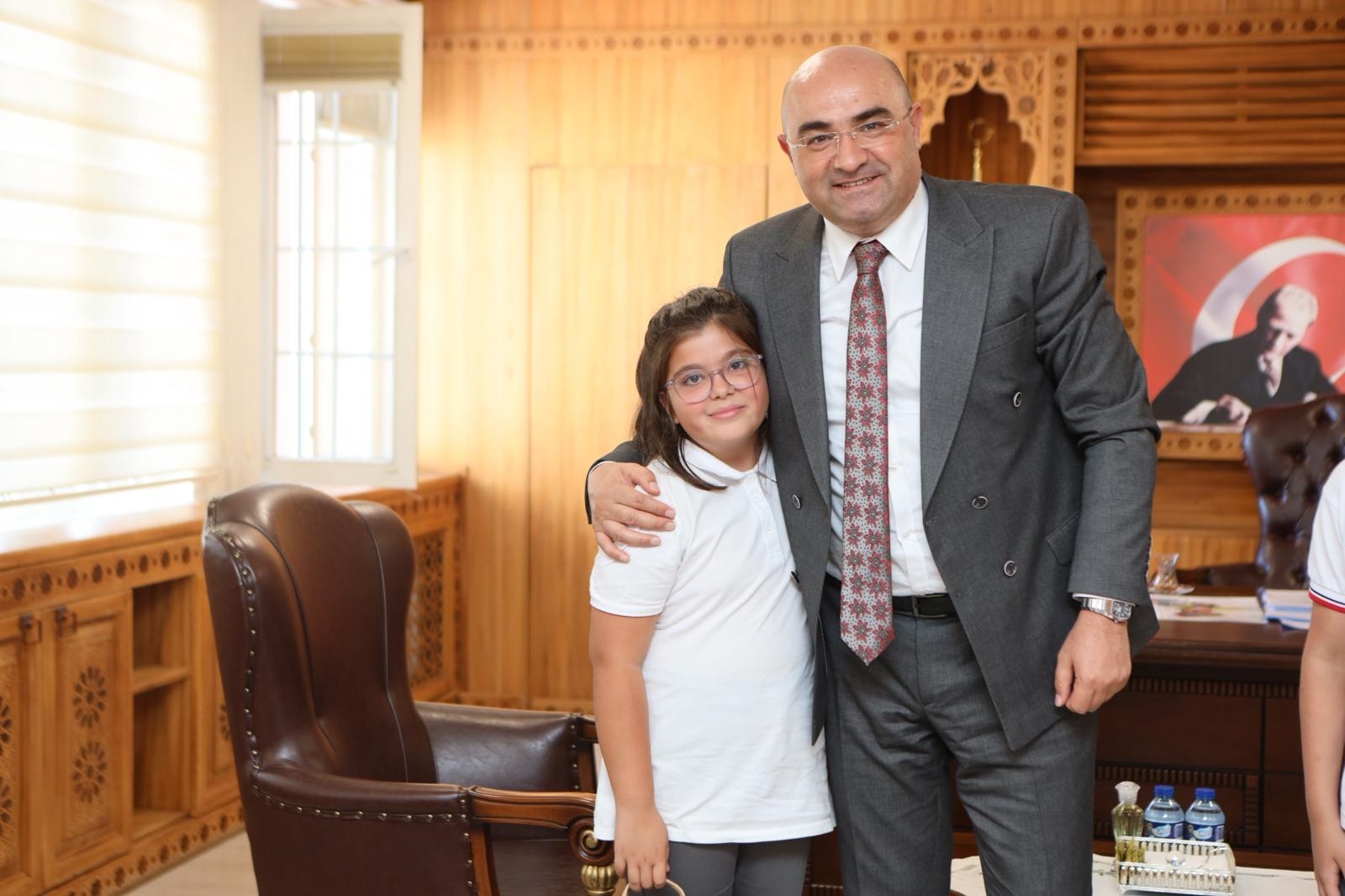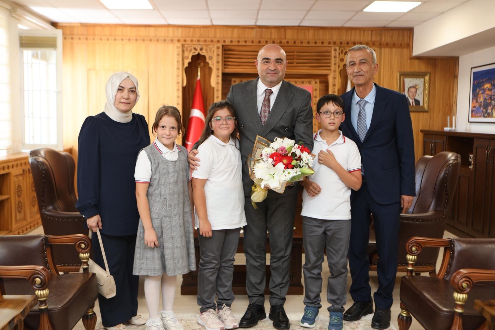 Mustafa Antepoğlu İlkokulu öğrencilerimiz Elif Zümra Akçaalan, Ömer Kağan Odalı ve Yaren Naz Doğan, İlköğretim Haftası münasebetiyle beraberinde İlçe Milli Eğitim Müdürümüz Şevket Küçükzoroğlu ile birlikte Kaymakamımız Sayın Hayrettin Baskın'ı makamında ziyaret etti.